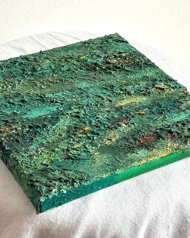 静翠(せいすい) 静かな緑、深い山、古民家の空気 「山の緑」「古民家の静けさ」「夏の生命力」 深い自然と時間をテーマに描きました 【素材・技法】 アクリル絵の具/モデリングペースト(テクスチャー) キャンバス:20cm×20cm 【ご注意】 ・実物と写真の色味が多少異なる場合があります。 ・直射日光・湿気を避けて設置してください。