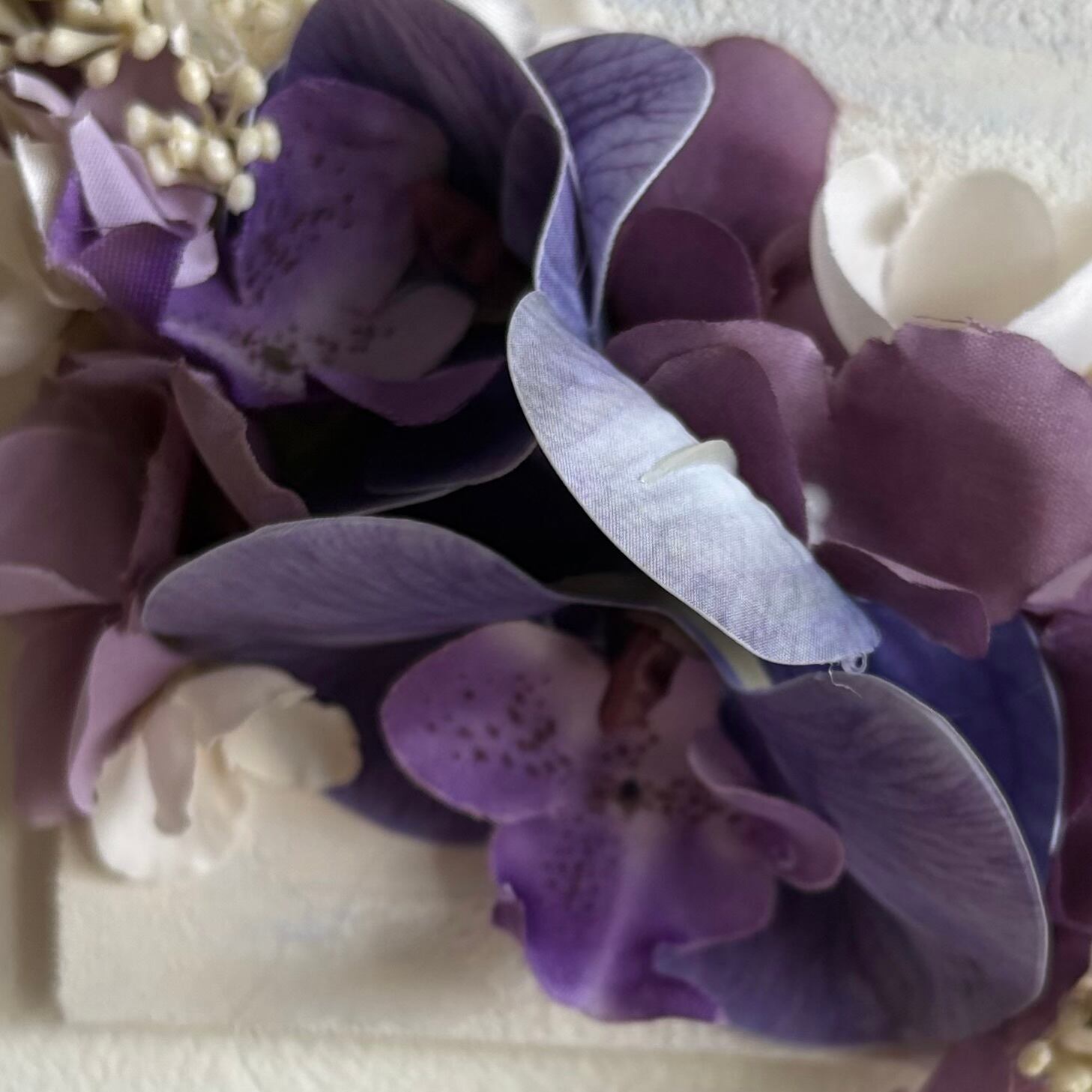 紫の胡蝶蘭を中心に、柔らかな色合いで束ねたフラワーアート。